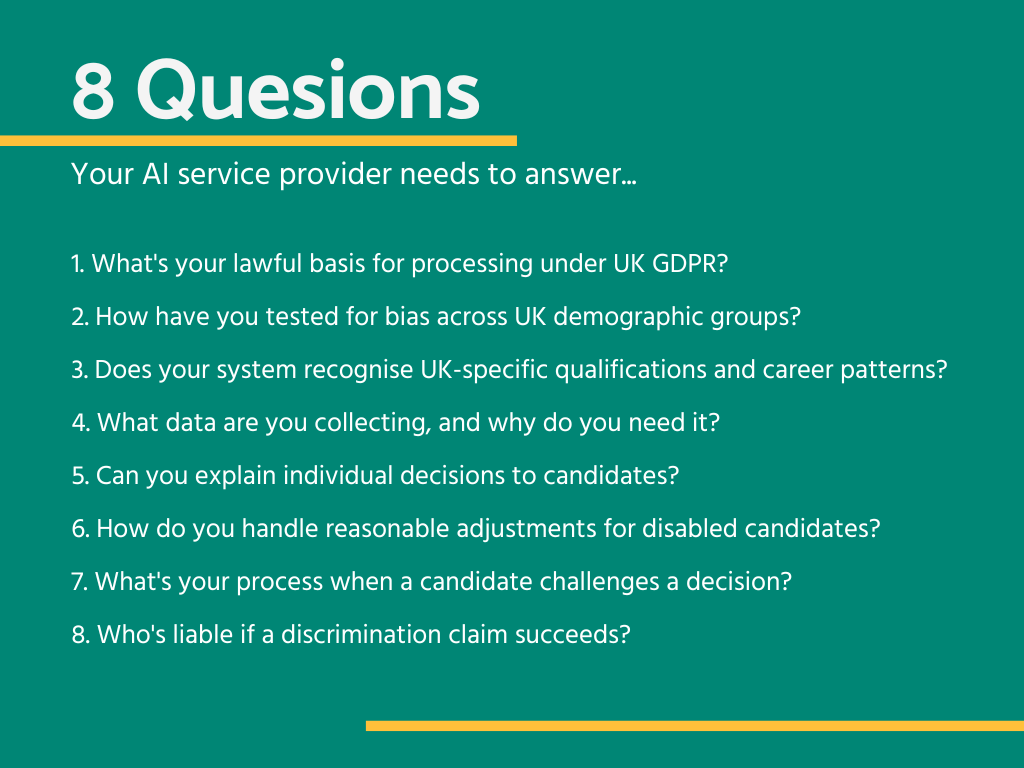 An AI system provider might tell you their algorithm is sophisticated. But can they explain why it rejected your best candidate? Can they demonstrate it understands UK defence careers and won’t discriminate? If you’re using AI recruitment tools in defence or engineering, these questions are your due diligence. Get answers in writing.
